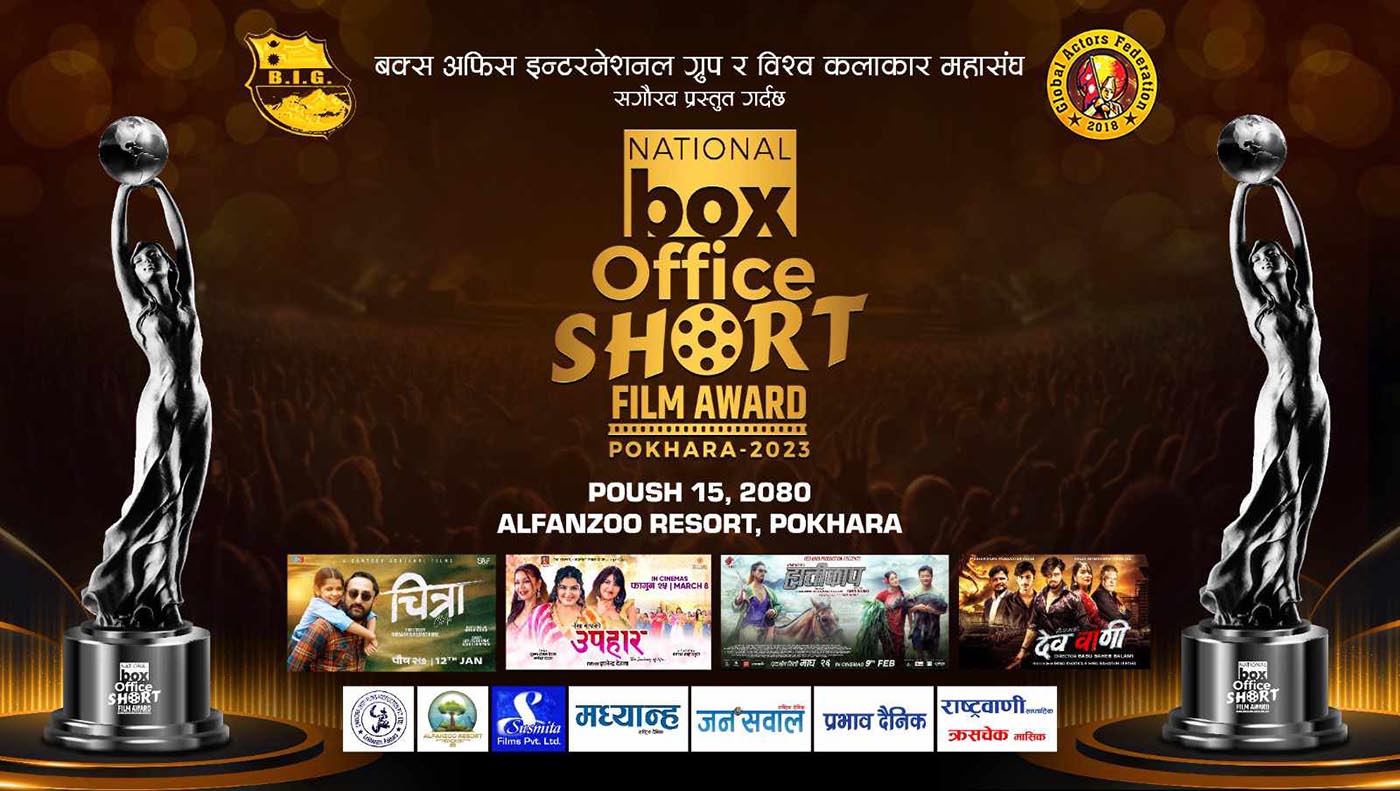 पोखरा । नेसनल बक्स अफिस सर्ट फिल्म अवार्ड २०८० संस्करण देशको पर्यटकीय शहर पोखरामा भव्य सम्पन्न भएको छ । नेसनल बक्स अफिस सर्ट फिल्म अवार्डको नयाँ संस्करण पोखरा महानगरपालिकाका नगरप्रमुख धनराज आचार्यको प्रमुख आतिथ्यतामा पोखराको पामेमा सम्पन्न भएको हो । हरेक वर्ष बक्स अफिस इन्टरनेशनल ग्रुप र ग्लोबल एक्ट्रेस फेडेरेशन (विश्व कलाकार महासंघ)ले आयोजना गर्दै आएको नेशनल बक्स अफिस सर्ट फिल्म अवार्ड २०८० मा २२ जनाले चुमेका छन् ।