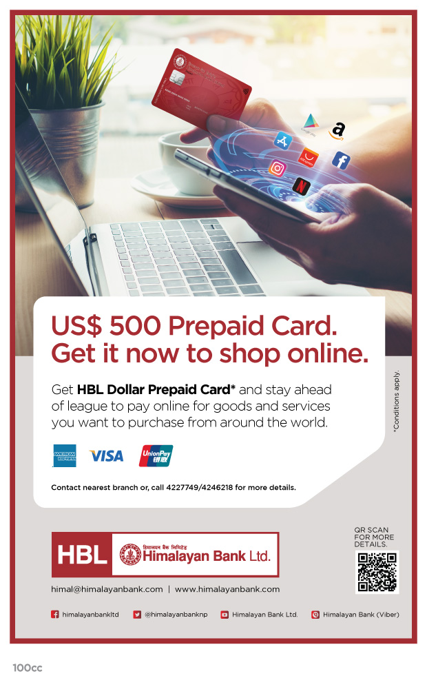 काठमाडौं । हिमालयन बैंक लिमिटेडले अन्तराष्ट्रिय भुक्तानी प्रयोजनका लागि ‘HBL डलर प्रीपेड कार्ड’ सुविधा प्रचलनमा ल्याएकोे छ । यस सुविधाअन्तर्गत हिमालयन बैंकका खातावालाहरुले प्रति वर्षमा अमेरिकी डलर पाँच सय सम्मको प्रीपेड कार्ड सुविधा प्राप्त गर्न सक्दछन् ।