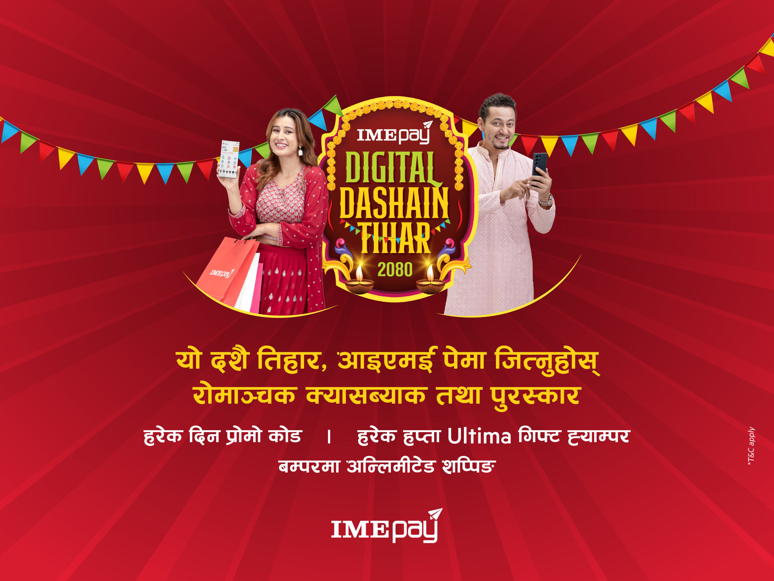 काठमाडौं । नेपालको पहिलो डिजिटल वालेट ‘आइएमई पे’ ले आउदै गरेको राष्ट्रिय चाड दशैं–तिहार तथा छठलार्ई लक्षित गर्दै आइएमई पे डिजिटल दशैं-तिहार अभियान सार्वजनिक गरेको छ ।