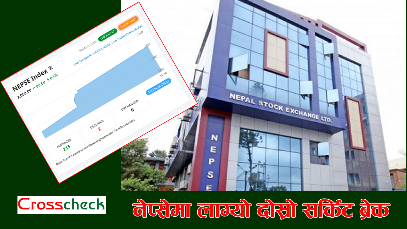 काठमाडौं । नेकपा एमालेसहित नेकपा माओवादी केन्द्र, राष्ट्रिय स्वतन्त्र पार्टीसहितको गठबन्धन सरकार बन्ने हजारहल्लाकै बीच शेयरबजारमा हरियाली छाएको छ । आज बजार खुलेपछि धितोपत्र बजारमा शेयर कारोबार मापक नेप्से परिसूचकमा केही घण्टामै दोस्रो सर्किट ब्रेक लागेको छ ।