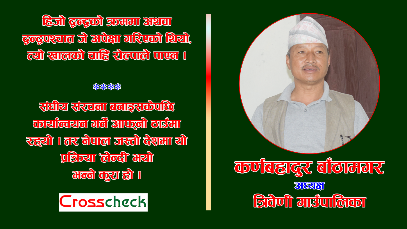 जबसम्म गाउँघरमा बस्ने मानिसहरुको जीवनस्तरमा उल्लेख्य परिवर्तन हुँदैन, तबसम्म मुलुकको विकास भयो भन्नु जायज होइन । स्थानीय तहहरु अहिले जनताको प्रत्यक्षरुपमा सेवा गर्ने सरकारको प्रतिनिधित्व गर्दछन् । उनीहरुले नै जनताका दैनिक जीवनमा आइपर्ने हरेक समस्यासँग पौंठेजोरी खेल्नुपर्ने, जस-अपजसको भागिदार बन्नुपर्ने हुन्छ । राम्रो काम गरे पनि, खराब काम गरे पनि ती सबैका लागि ताली वा गाली खाने भनेकै अहिले स्थानीय तहका जनप्रतिनिधिहरुले हो, स्थानीय सरकारले हो । भौगोलिक हिसाबले विविधतायुक्त नेपालका धेरैजति भूभाग पहाडी क्षेत्रमा पर्दछन् भने कतिपय हिमाली जिल्लामा पर्दछन् । कठिन भूगोल होस् या सुगम, सबै ठाउँका जनतालाई राज्यले कुनै पनि ढंगले भेदभाव गर्नु हुँदैन । समानुपातिक ढंगले मुलुकको विकास गर्न आवश्यक छ । संघीयता निर्माणपछि बनेका स्थानीय तहहरुलाई सर्वसाधारणले गाउँ–गाउँमा सिंहदरबार आएको भनेर बुझ्ने गरेका छन् । यस्तो बेलामा गाउँ–घरमै सेवा सुविधा प्राप्त गर्ने आशा र अपेक्षा बढ्नु स्वभाविकै हो । तर पनि स्थानीय तहका सरकार प्रमुखहरुले झेल्ने गरेको सबैभन्दा ठूलो समस्या भनेकै अपर्याप्त बजेटको हो । विगतका आर्थिक वर्षहरुमा भन्दा संघीय सरकारले बजेट बढाएर पठाउनुपर्नेमा क्रमशः घटाउँदै लगेको छ । त्यसबाट स्थानीय तहले राम्रोसँग काम गर्न सकिरहेका छैनन् । आगामी आर्थिक वर्षको बजेट निर्माण हुँदाचाहिं प्रत्यक्षरुपमा दिइने बजेट स्थानीय तहका लागि व्यापकरुपमा बृद्धि होस् भन्नुहुन्छ त्रिवेणी गाउँपालिकाका अध्यक्ष कर्णबहादुर बाँठामगर । अध्यक्ष बाँठामगरसँग त्रिवेणी गाउँपालिकाको विकास–निर्माणका कार्यहरु, उत्पादनसँग सम्बन्धित विषयवस्तु, स्वरोजगारको अवस्था, पर्यटकीय क्षेत्रको संरक्षण, प्रवद्र्धन र विस्तारको स्थितिलगायत विविधि विषयमा केन्द्रित रहेर क्रसचेकका सम्पादक टंक कार्कीले गरेको कुराकानीको सम्पादित अंश :