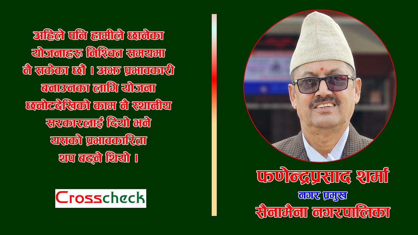 जनताका आवश्यकताहरु के हुन् भन्ने कुरा स्थानीय सरकारले राम्रोसँग पहिचान गरेको हुन्छ । त्यसैले पनि स्थानीय सरकारको महत्व अझ बढेको हो । स्थानीय तहहरुलाई अझ बढी शक्तिशाली, प्रभावकारी र आर्थिकरुपमा सबल बनाउनुपर्छ भन्नेमा सबै क्षेत्रबाट आवाज उठ्न थालेको छ । अहिले प्रधानमन्त्रीले समेत तीन करोडभन्दा मुनिका योजनाहरु संघीय सरकारबाट नगर्ने घोषणा गरिसक्नुभएको छ । आगामी आर्थिक वर्षको बजेट निर्माणको प्रक्रिया प्रारम्भ हुन थालिसकेको यस परिस्थितिमा त्यो कार्य निकै नै महत्वपूर्ण हुनसक्छ स्थानीय सरकारका लागि । सैनामैना नगरपालिकाका प्रमुख फणेन्द्रप्रसाद शर्मा भन्नुहुन्छ- सशर्त अनुदानको रकम स्थानीय सरकारलाई नै दिनुपर्छ । क्षेत्र तोकेर दिएको अवस्थामा त्यसको प्राथमिकता निर्धारण हुन सक्दैन । हामीलाई अनुदान दिनु छ भने कृषिमा यति, शिक्षामा यति, स्वास्थ्यमा यति भनेर दिए हुन्छ । माथिबाट यो गर भनेर दियो भने त्यसले परिणाम दिन सक्दैन । त्यस्तै प्रदेशस्तरीय योजनाको रकम पनि स्थानीय सरकारलाई नै दिनुपर्छ । अनिमात्रै देखिने गरी काम हुनसक्छ । आफैंले योजना छनोट गरेर गर्न सकियो भने त्यो निकै प्रभावकारी हुन्छ । अहिले पनि हामीले छानेका योजनाहरू निश्चित समयमा नै सकेका छौं । अझ प्रभावकारी बनाउनका लागि योजना छनोटदेखिको काम नै स्थानीय सरकारलाई दियो भने यसको प्रभावकारिता थप बढ्छ । आफ्नो कुरालाई प्रष्टसँग राख्नुहुने सैनामैना नगरपालिकाका नगर प्रमुख फणेन्द्रप्रसाद शर्मासँग क्रसचेकका सम्पादक टंक कार्कीले गरेको कुराकानीको सम्पादित अंश :