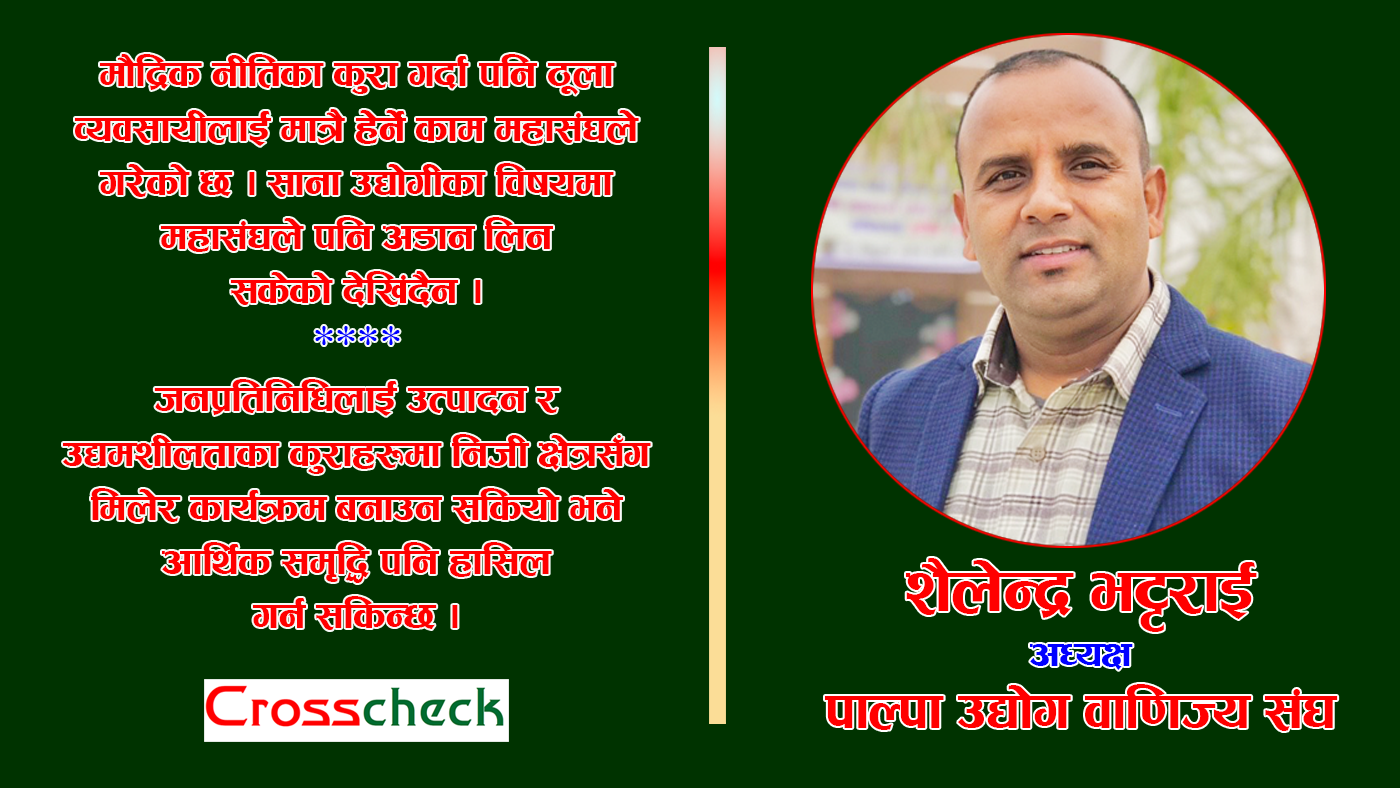 देशभित्र रोजगारी सिर्जना नगरेसम्म मुलुकले प्रगति गर्न सक्दैन । त्यसका लागि लगानीको वातावरण बनाउनु पर्दछ । अहिले लगानी सम्मेलनको कुरा आइरहेको छ, त्यो निकै राम्रो कुरा हो । तर सरकारले लगानी गर्ने वातावरणको ग्यारेन्टी गर्नु पर्ने आवश्यकता छ । अहिले काम गर्न सक्ने युवाहरू धमाधम विदेश पलायन भइरहेका छन् । रेमिट्यान्सका कुरा बजेटमा आउँछ । राज्यले पनि विदेश गएर रेमिट्यान्स पठाउ भनेको जस्तो अवस्था छ । उपभोग गर्ने वर्ग विदेश गएको अवस्थामा कसरी लगानी गरेर उत्पादन गर्न सकिन्छ ? काम गर्ने मानिसहरू बाहिर रहेको अवस्थामा छ । हामीले उत्पादनमूलक क्षेत्रमा लगानी गर्न सकेको खण्डमा आत्मनिर्भर बन्न सक्छौं । जबसम्म हामी आत्मनिर्भर बन्दैनौं, तबसम्म हामीले ठूला कुरा नगर्दा हुन्छ । निजी क्षेत्रलाई हेर्ने नजर सबै सरकारले फेरिदिनु पर्यो भन्नुहुन्छ शैलेन्द्र भट्टराई । पाल्पा उद्योग वाणिज्य संघका अध्यक्ष शैलेन्द्र भट्टराईसँग क्रसचेकका सम्पादक टंक कार्कीले गरेको कुराकानीको सम्पादित अंश :