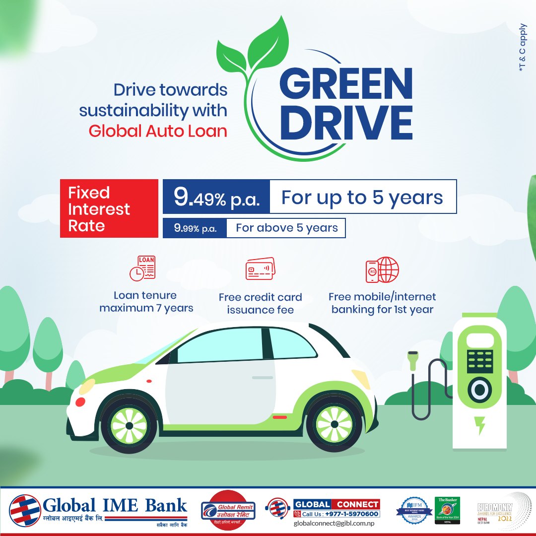काठमाडौं । ग्लोबल आइएमई बैंक लिमिटेडले अटो कर्जाअन्तर्गत विद्युतीय सवारी साधन प्रवद्र्धन गर्न न्यूनतम् ब्याजदरमा ग्रिन ड्राइभ योजना सार्वजनिक गरेको छ । यस ग्रिन ड्राइभ योजनाअन्तर्गत व्यक्तिगत प्रयोजनको लागि चारपाङ्ग्रे सवारी साधन खरिद गर्दा ९.४९ प्रतिशतदेखि ९.९९ प्रतिशतसम्मको स्थिर ब्याजदरमा कर्जा पाइनेछ । कर्जाको अवधि ५ वर्षसम्मको लागि स्थिर ९.४९ प्रतिशत र ५ वर्षभन्दा बढिको लागि स्थिर ९.९९ प्रतिशत व्याजदर रहेको छ ।