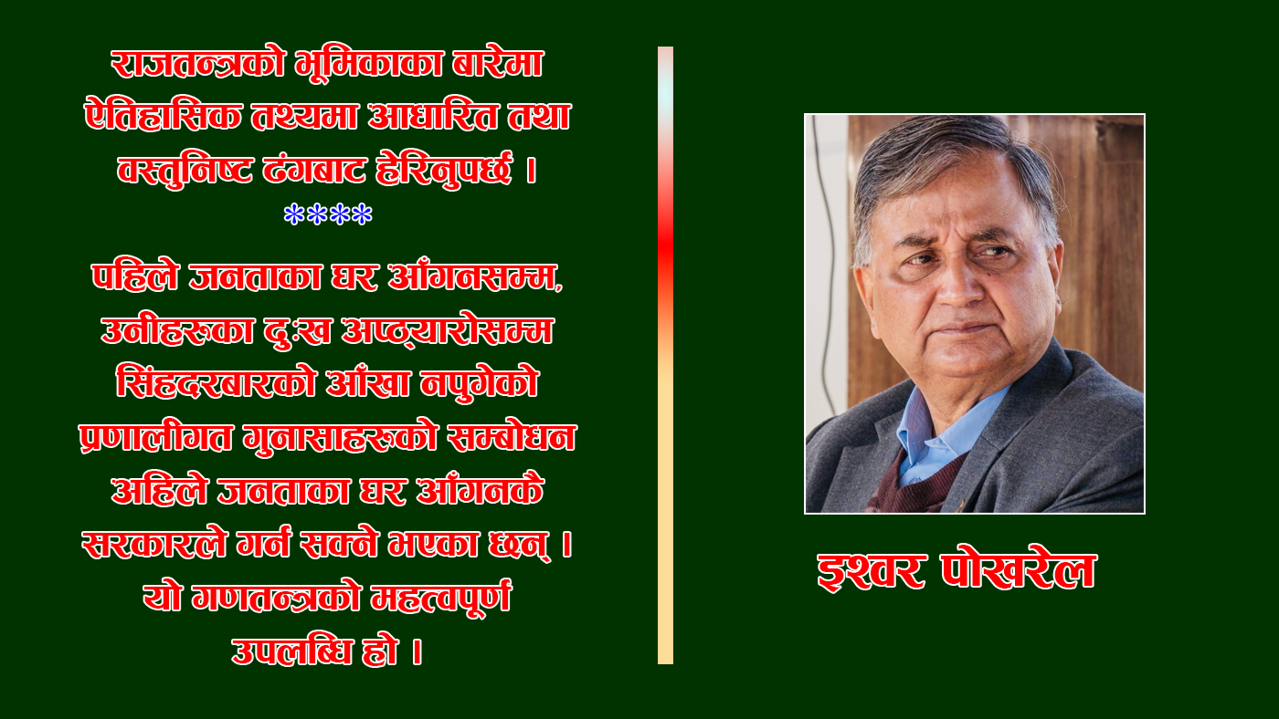 राजतन्त्रको भूमिकाका बारेमा ऐतिहासिक तथ्यमा आधारित तथा वस्तुनिष्ट ढंगबाट हेरिनुपर्छ । नेपालको एकीकरणका लागि पृथ्वीनारायण शाहले सकारात्मक र ऐतिहासिक पहल गरेकै कारण आज मुलुक नेपाल राष्ट्रका रूपमा रहन सकेको हो । तर त्यसपछिका राजाहरुको चरित्र आमरूपमा निरंकुश र स्वेच्छाचारी रह्यो । वंश परम्परामा आधारित अनिर्वाचित सत्तालाई प्रतिनिधित्व गर्ने राजतन्त्र निरंकुश र स्वेच्छाचारी रह्यो, आमरूपमा जनता र देशको पक्षमा रहेन । यही पृष्ठभूमि र सन्दर्भमा लोकतन्त्र-गणतन्त्रको नारा सशक्त बन्दै गयो । नेपाली जनता र नेपाली जनतालाई प्रतिनिधित्व गर्ने राजनीतिक पार्टीहरूप्रति निरन्तरको विश्वासघात र शत्रुवत् व्यवहारका कारण राजतन्त्रले नेपालबाट सदासदाका लागि बिदा हुनुपर्‍यो ।