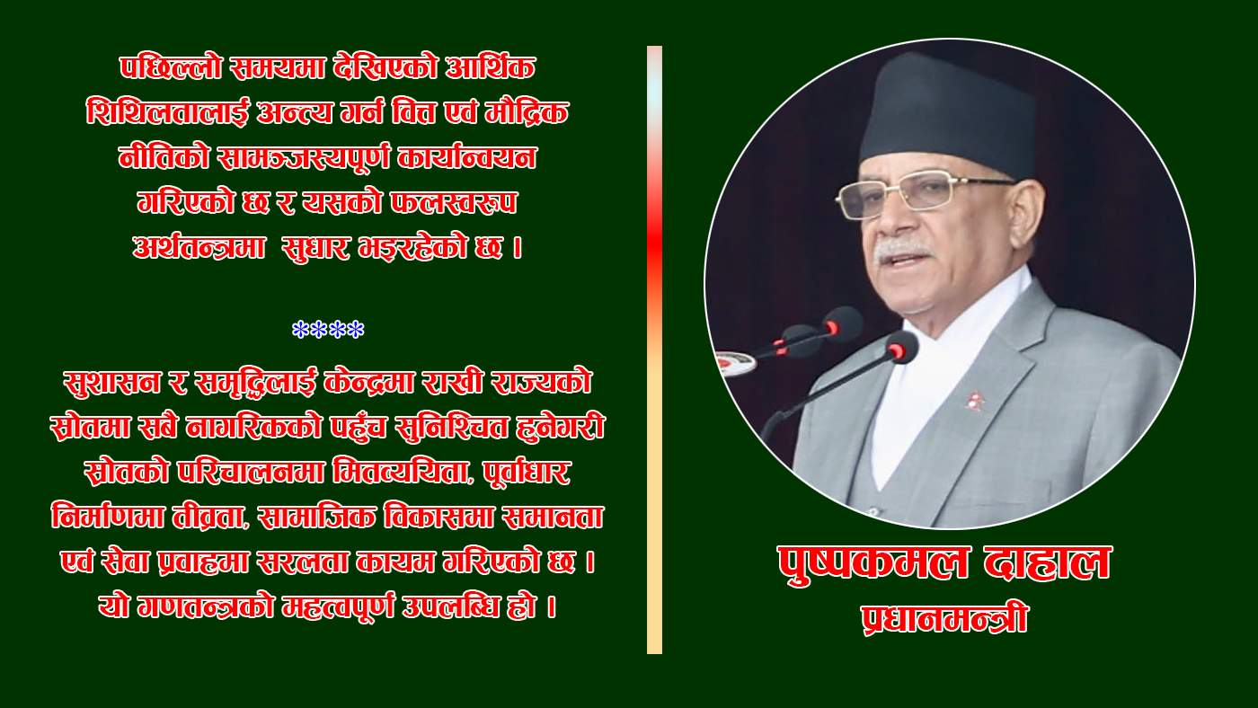 प्रधानमन्त्री पुष्पकमल दाहाल ‘प्रचण्ड’ले मुलुकलाई आर्थिक-सामाजिक रूपमा सबल र समुन्नत राष्ट्र बनाई जनताको जीवनस्तरमा उल्लेखनीय सुधार ल्याउने प्रयासले क्रमशः मूर्तरूप लिँदै गएको बताउनुभएको छ । गणतन्त्र दिवस २०८१ का अवसरमा सैनिक मञ्च टुँडिखेलमा आज आयोजित विशेष समारोहलाई सम्बोधन गर्दै उहाँले स्वतन्त्र र सन्तुलित परराष्ट्र नीति अवलम्बन गर्दै राष्ट्रिय हितको रक्षा गर्न सरकार दृढ रहेको बताउनुभयो ।