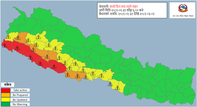 काठमाडौँ । जल तथा मौसम विज्ञान विभागले आगामी तीन दिन (जेठ ३२ देखि असार २ गतेसम्म) मध्य तथा पश्चिम तराईमा अत्यधिक गर्मीको सम्भावना रहेको जनाउँदै ती भेगका सर्वसाधारणलाई सावधानी अपनाउन आग्रह गरेको छ ।