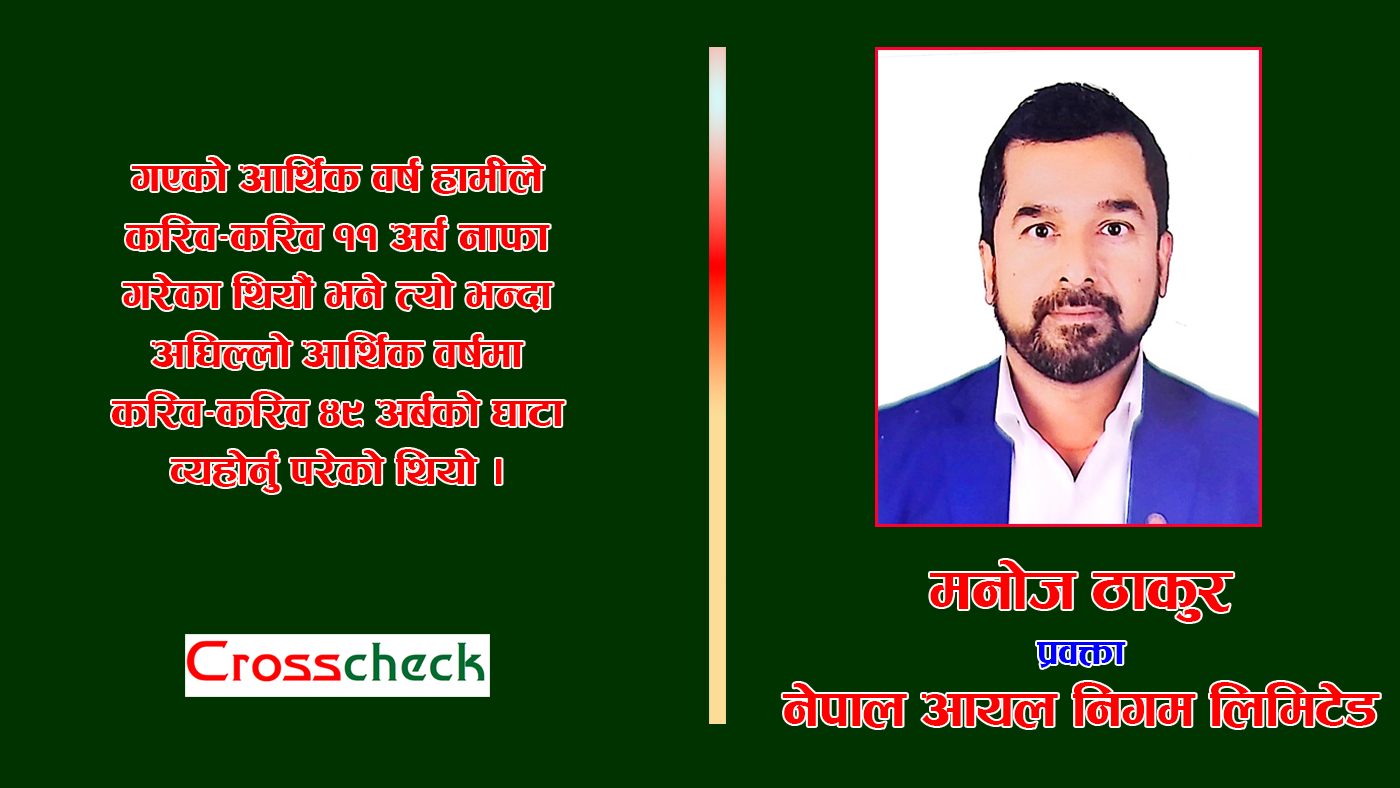मनोज ठाकुर नेपाल आयल निगमको प्रवक्ता हुनुहुन्छ । नेपाल आयल निगम पेट्रोलियम पदार्थको आयात गर्ने एकमात्र आधिकारिक सरकारी संस्थान हो । आयल निगमलाई कसरी अझ सशक्त बनाउन सकिन्छ, व्यवसायिकढंगले यसलाई अझ प्रभावकारी बनाउन के कस्ता काम गर्नुपर्छ भनेर दिनरात लागिरहनुहुन्छ प्रवक्ता ठाकुर । निगमले पनि व्यापारमा विविधिकरण गर्नुपर्छ भन्ने मान्यता राख्नुहुने ठाकुर आफू आयल निगममै कार्यरत भएर पनि नवीकरणीय ऊर्जाको प्रयोग बढाउन सर्वसाधारणलाई आह्वान गर्नुहुन्छ । निगमका कर्मचारीले सर्वसाधारणलाई महँगीको मारमा पारेर ठूलो रकम बोनस खाइरहेका छन् भन्ने चर्चा-परिचर्चा पनि व्यापक रुपमा सुन्न सकिन्छ, त्यो वास्तविक नभएको बताउनुहुने प्रवक्ता ठाकुरसँग निगमका विभिन्न आयोजना तथा यसले गरिरहेका गतिविधिहरूमा केन्द्रित रहेर क्रसचेकका सम्पादक टंक कार्कीले गरेको कुराकानीको सम्पादित अंश :