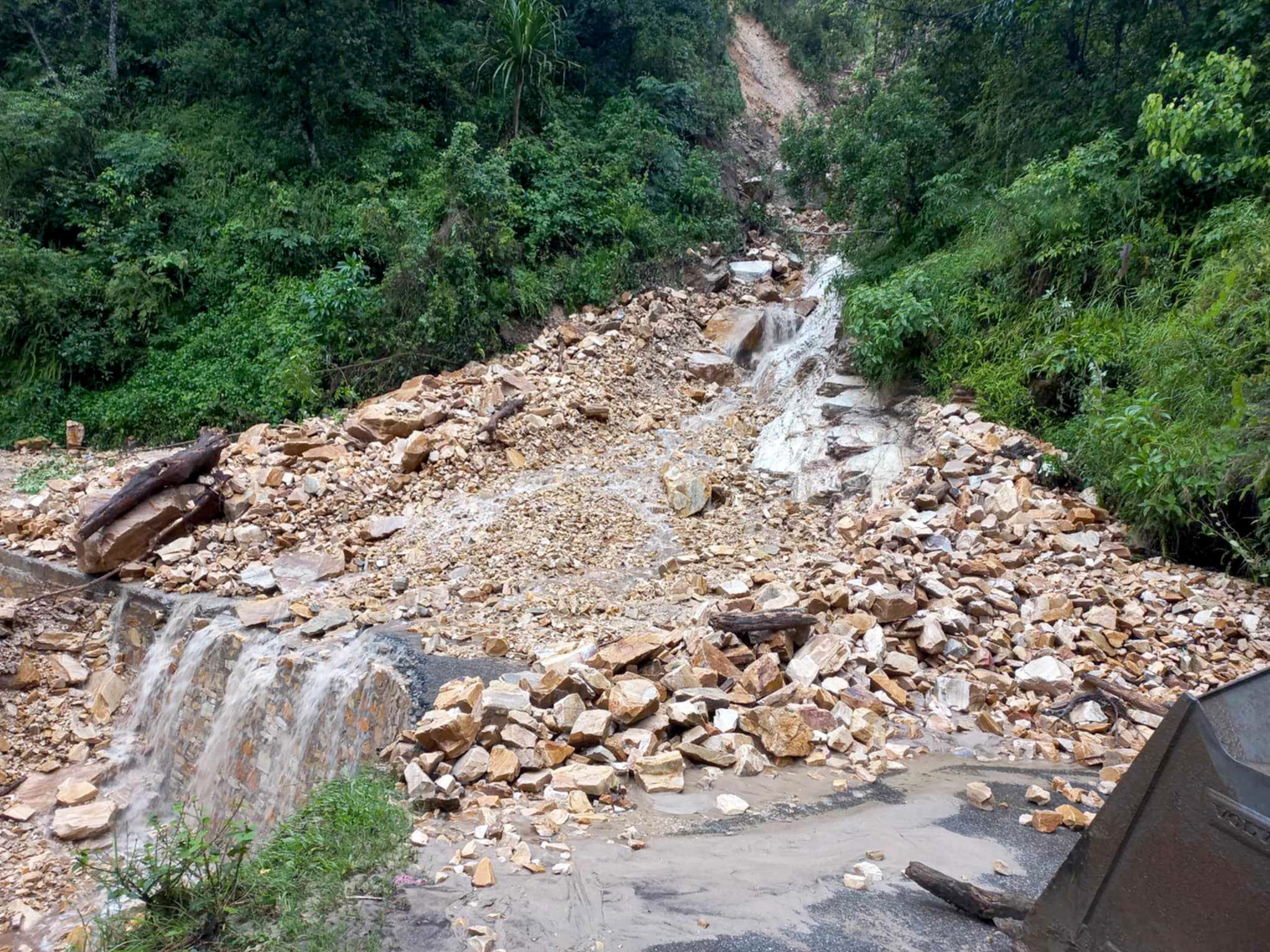 अविरल वर्षाले आइतबार बिहान डुम्रे बेँसीसहर सडकअन्तर्गत बेसीसहर नगरपालिका–१ दलालमा झरेको पहिरो । पहिरोले यस सडकको विभिन्न स्थानमा अवरुद्ध भएकाले सवारीसाधन सञ्चालन हुन नसक्दा यात्रुहरु अलपत्र परेका छन् । तस्बिर जनक श्रेष्ठ/रासस