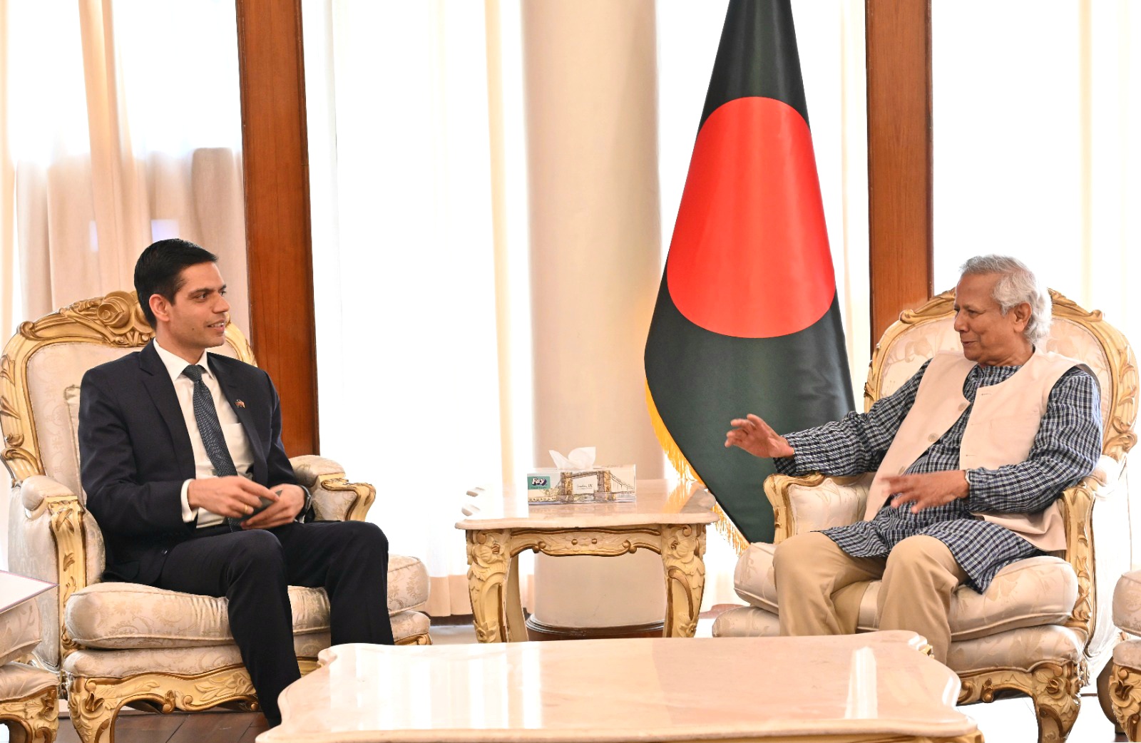 त्यस अवसरमा राजदूत भण्डारीले सरकार प्रमुखको रुपमा नियुक्त भएकामा बधाई ज्ञापन गर्दै प्रधानमन्त्री केपी शर्मा ओलीले पठाउनुभएको पत्र हस्तान्तरण गर्नुभएको थियो । नेपाल सरकारले बङ्गादेशप्रति दर्शाएको समर्थन र ऐक्यबद्धताको सरकार प्रमुख युनुसले प्रशंसा गर्दै दुई देशबीच राजनीतिक र जनस्तरमा सौहार्दपूर्ण सम्बन्ध रहेकोमा सन्तोष व्यक्त गर्नुभएको दूतावासले जारी गरेका विज्ञप्तिमा जनाइएको छ ।