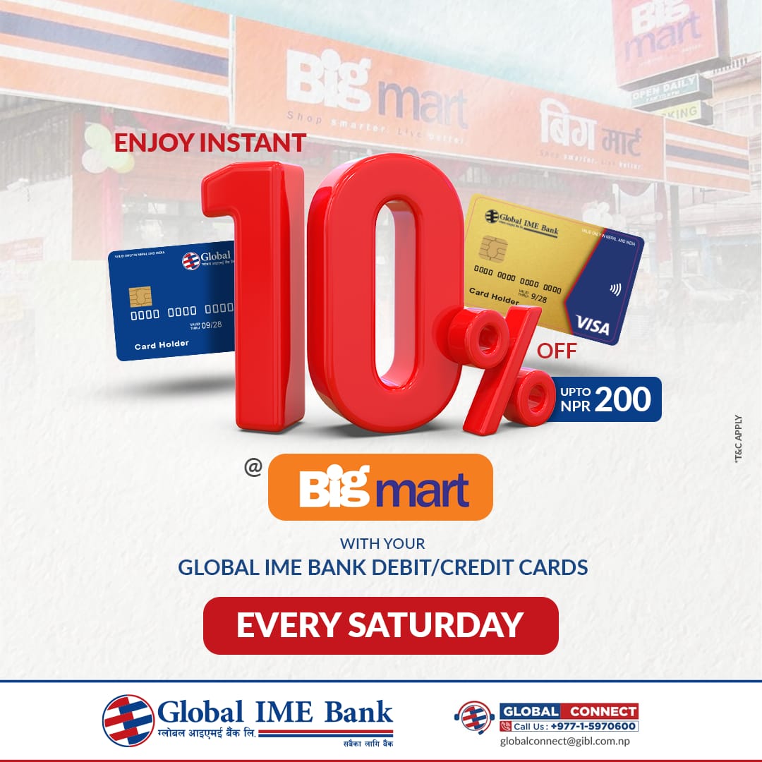 ग्लोबल आइएमई बैंकका डेबिट तथा क्रेडिट कार्डबाहकलाई बिग मार्टमा १० प्रतिशत छुट
