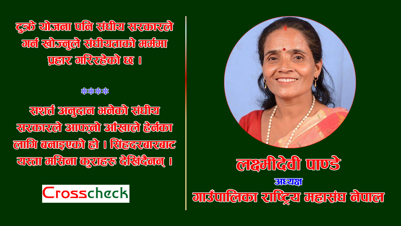 जनताको निराशालाई हटाउने गरी सरकारले काम गर्नुपर्छ भन्नुहुन्छ गाउँपालिका राष्ट्रिय महासंघ नेपालका अध्यक्ष लक्ष्मीदेवी पाण्डे । भएको राजश्व सही ठाउँमा प्रयोग होस्, थोरै होस् तर राम्रो काम होस् भन्ने धारणा राख्नुहुने पाण्डे संघीय सरकारले अभिभावकको भूमिका खेलोस् भन्नुहुन्छ । संघीयतालाई बलियो बनाउन स्थानीय तहले पाएका अधिकारहरुको पूर्ण प्रयोगमा संघीय सरकारले व्यवहारिकरुपमा अवरोध गर्नुहुँदैन भन्ने स्पष्ट धारणा राख्नुहुने पाण्डेसँग क्रसचेकका सम्पादक टंक कार्कीले गरेको कुराकानीको सम्पादित अंश ।