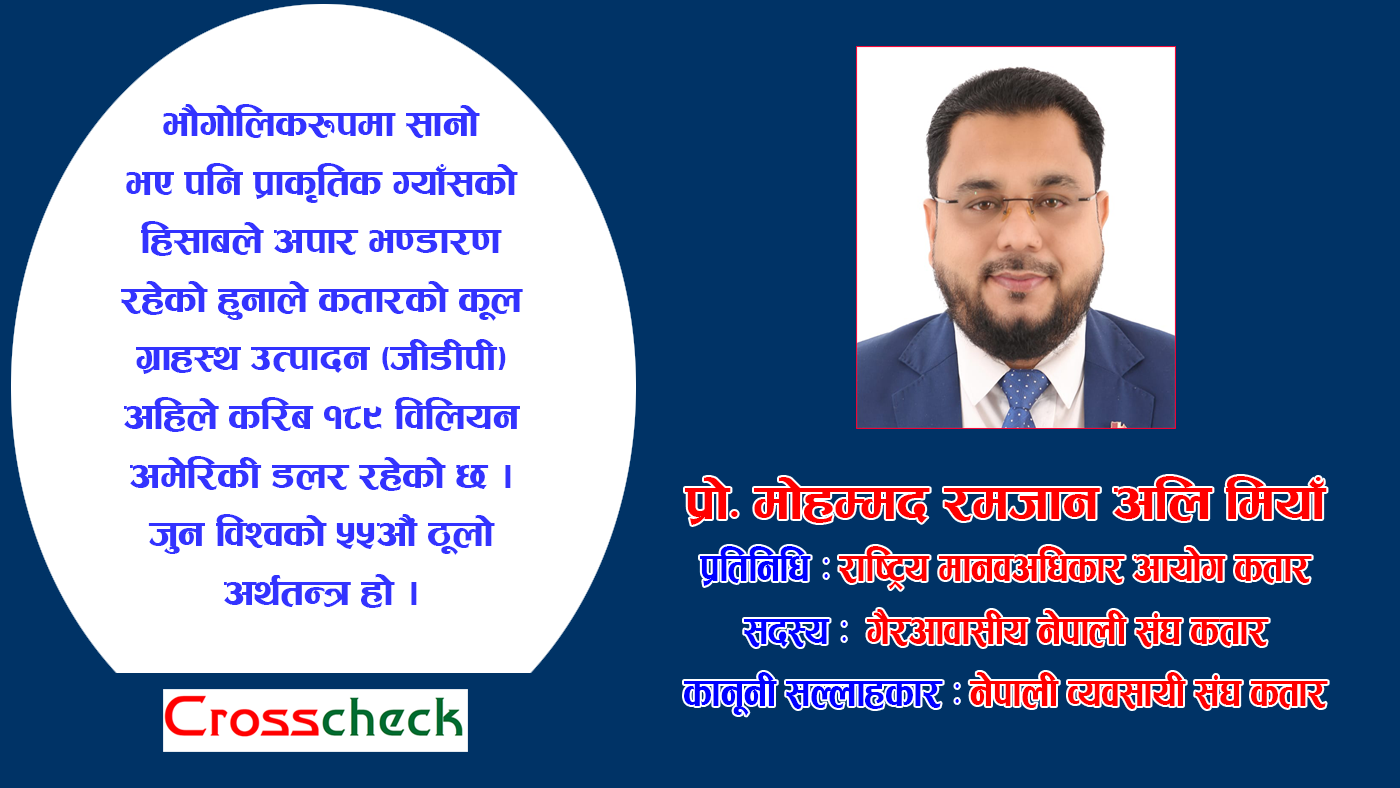 नेपालीहरु विश्वका विभिन्न मुलुकमा गएर कार्यरत रहिरहे पनि उनीहरुको मन भने नेपालमै हुन्छ । कसरी नेपाललाई समृद्ध बनाउन सकिन्छ, नेपाल पनि अन्य देशझैं विकसित भइदिए हुन्थ्यो, नेपालको प्रतिष्ठा अझ उचाईमा पुगिदिए हुन्थ्यो भन्ने मनमस्तिष्कमा बसिरहेको हुन्छ । त्यसैअनुरुपका कामहरु समेत विदेशमा बस्दासमेत गरिरहेका हुन्छन् । त्यस्तैमध्येका एक हुनुहुन्छ प्रोफेसर मोहम्मद रमजान अलि मियाँ । विगत करिब दुई दशकदेखि कतारमा रहेर नेपाल र नेपालीका लागि काम गरिरहनुभएका मियाँ राष्ट्रिय मानवअधिकार आयोग कतारस्थित नेपाली समाज प्रतिनिधि, गैरआवासीय नेपाली संघ कतार तथा नेपाली व्यवसायी संघ कतारको कानूनी सल्लाहकार समेत हुनुहुन्छ । नेपाल र कतारको सम्बन्ध, नेपालले कतारबाट सिक्नसक्ने विषयवस्तु, नेपालसँगको व्यापार घाटा कम गर्न खेल्नुपर्ने भूमिका लगायत विविध समसामयिक विषयवस्तुलाई समेटेर क्रसचेकका सम्पादक टंक कार्कीले प्रोफेसर मोहम्मद रमजान अलि मियाँसँग गरेको कुराकानीको सम्पादित अंश ।