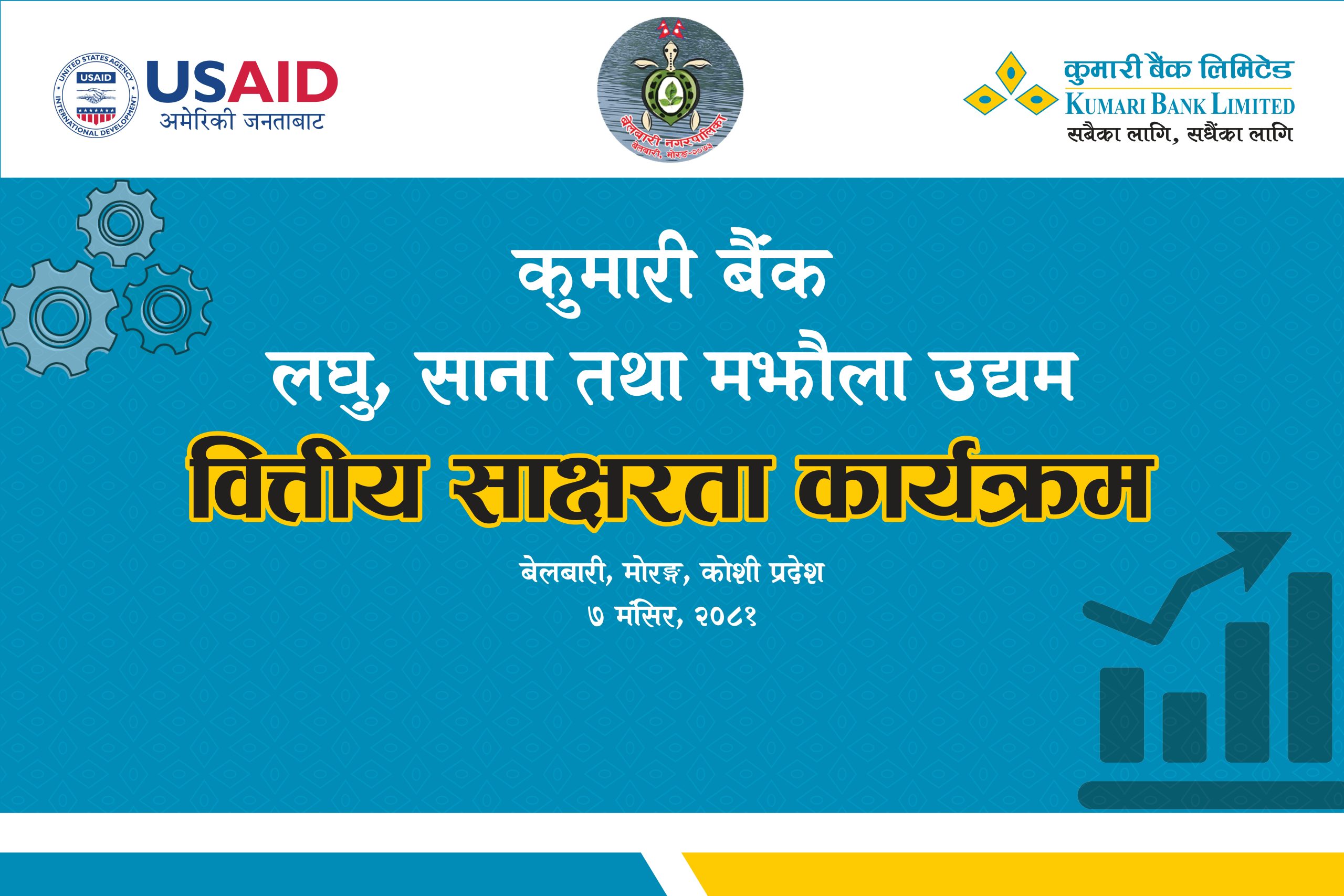 काठमाडौं । युएसएडसँगको साझेदारीमा ‘देशै भरि बर्षै भरि’ उद्यमशिलता विकास एवं प्रवद्र्धनका लागि नियमितरुपमा उद्यमी प्रशिक्षण अभियान सञ्चालन गरिरहेको कुमारी बैंकले बेलबारी नगरपालिका, मोरङसँगको समन्वयमा बेलबारीका उद्यमीहरुको व्यवसायिकता विकासका लागि प्रशिक्षण कार्यक्रम संपन्न गरेको छ ।