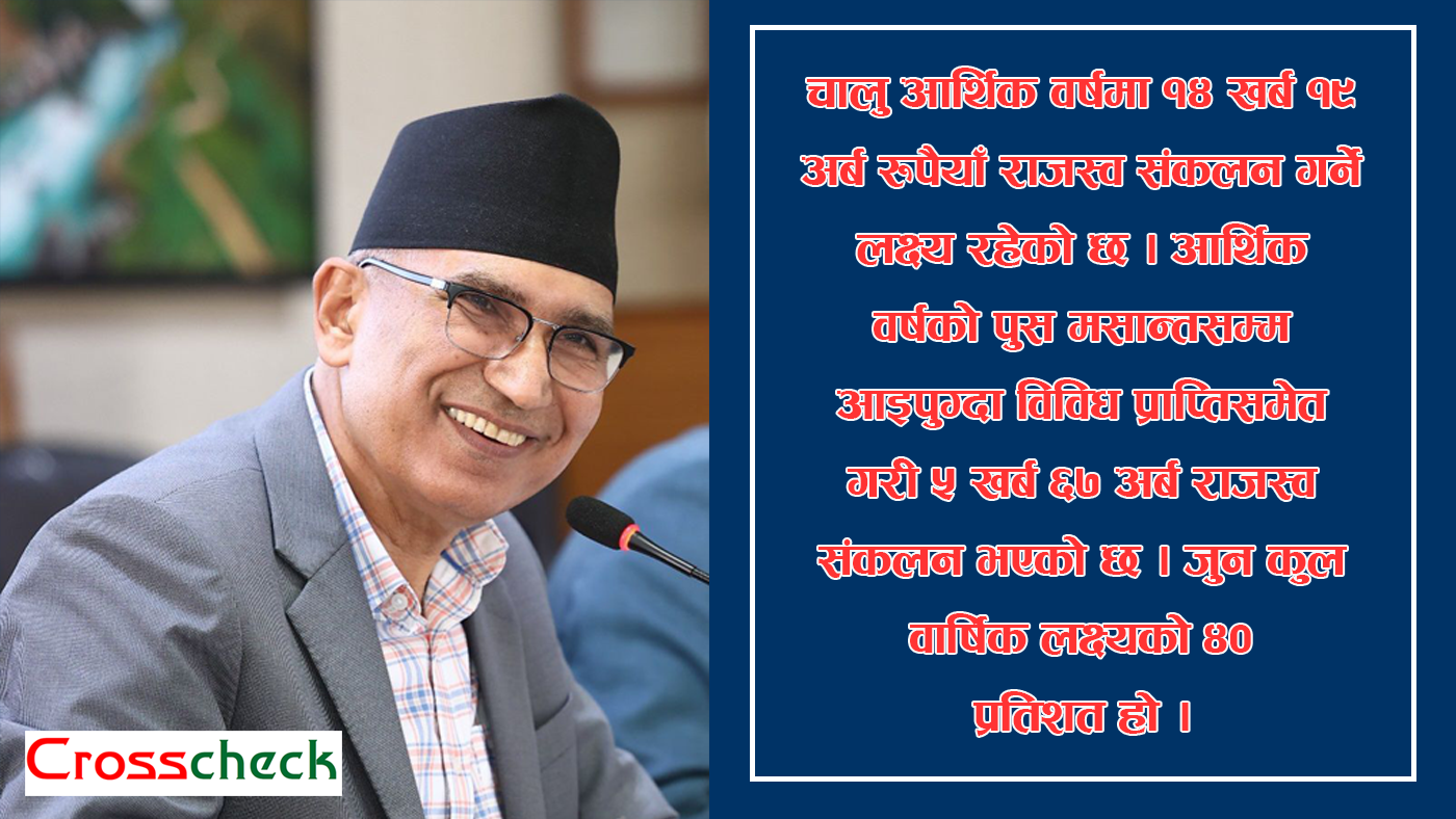 चालु आर्थिक वर्षको ६ महिनामा ६ खर्ब ७२ अर्ब राजस्व संकलन गर्ने लक्ष्य थियो । अहिले संकलन भएको राजस्व लक्ष्यको ८४ प्रतिशत हो । पुस महिनामा मात्र १ खर्ब ६० अर्ब राजस्व संकलन भएको छ । उपप्रधानमन्त्री एवं अर्थमन्त्री विष्णुप्रसाद पौडेलले विगतको तुलनामा राजस्व संकलन बढी हुनु सकारात्मक भएको उल्लेख गर्दै लक्ष्य अनुरुप राजस्व संकलनमा केन्द्रित हुने बताउनुभयो ।