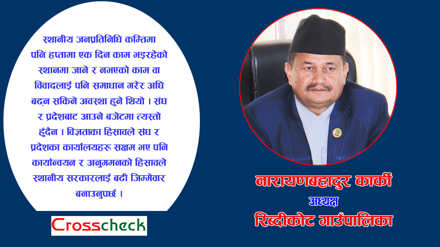 संघ र प्रदेशको भन्दा स्थानीय तहको पूँजीगत खर्च गर्नसक्ने क्षमता राम्रो रहेको बताउनुहुन्छ रिब्दीकोट गाउँपालिकाका अध्यक्ष नारायणबहादुर कार्की । पालिकाहरूमा ८० प्रतिशतभन्दा बढी पूँजीगत खर्च हुन्छ । यसरी हेर्दा कुल बजेटको ठूलो हिस्सा पालिकाहरूमा पठाइयो भने त्यसले राम्रो काम गर्न सकिन्छ भन्ने धारणा राख्नुहुने अध्यक्ष कार्कीसँग क्रसचेक मासिकका प्रतिनिधिले गरेको कुराकानीको सम्पादित अंश ।
