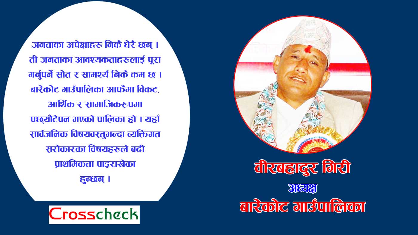 संघले विशेष गरेर वित्तीय व्यवस्थापन र नीति निर्माणमा नै काम गनु पर्छ, तल्लो तहमा संघले हात हाल्नै हुँदैन भन्ने स्पष्ट दृष्टिकोण राख्नुहुन्छ बारेकोट गाउँपालिकाका अध्यक्ष वीरबहादुर गिरी । ठूला आयोजनाहरु निर्माण गर्ने काम संघले गर्नुपर्यो । प्रदेशले प्रदेशभित्र योजनाको प्रकृति र बजेटको सीमा निर्धारणको काम गर्नुपर्छ अनि स्थानीय सरकारले कार्यान्वयन मात्रै गर्नुपर्ने हो । तर, हाम्रोमा संघले पनि बजेट बिनियोजन गर्ने, प्रदेशले पनि गर्ने र स्थानीय तहले पनि गर्ने गरेका छन् । टोलका लागि संघ, प्रदेश पनि आउनु पर्ने र स्थानीय तहको वडा पनि लाग्नुपर्ने अवस्था अहिले छ । यो अभ्यास गलत हो । यो अभ्यासले व्यवस्थालाई पनि बलियो बनाउँदैन र व्यवस्थाप्रति जनताको बुझाइलाई पनि बलियो बनाउँदैन । यो विषयमा सरकारले पुनविचार गर्नुपर्छ भन्नुहुने अध्यक्ष बारेकोट गाउँपालिकाका अध्यक्ष वीरबहादुर गिरीसँग क्रसचेकका सम्पादक टंक कार्कीले गरेको कुराकानीको सम्पादित अंश :