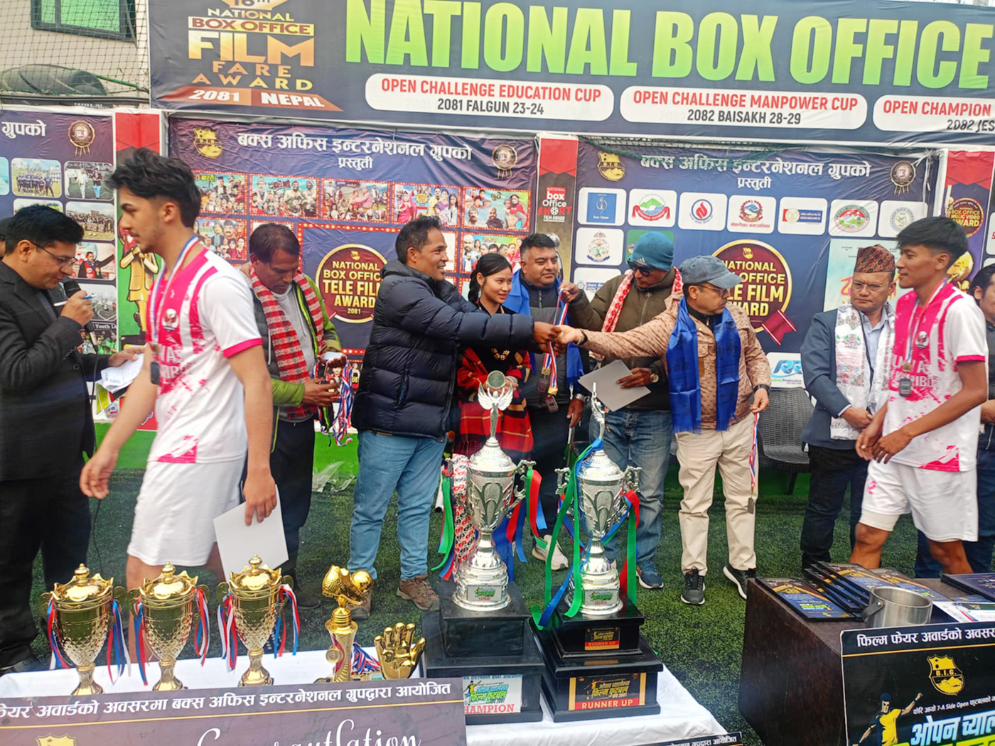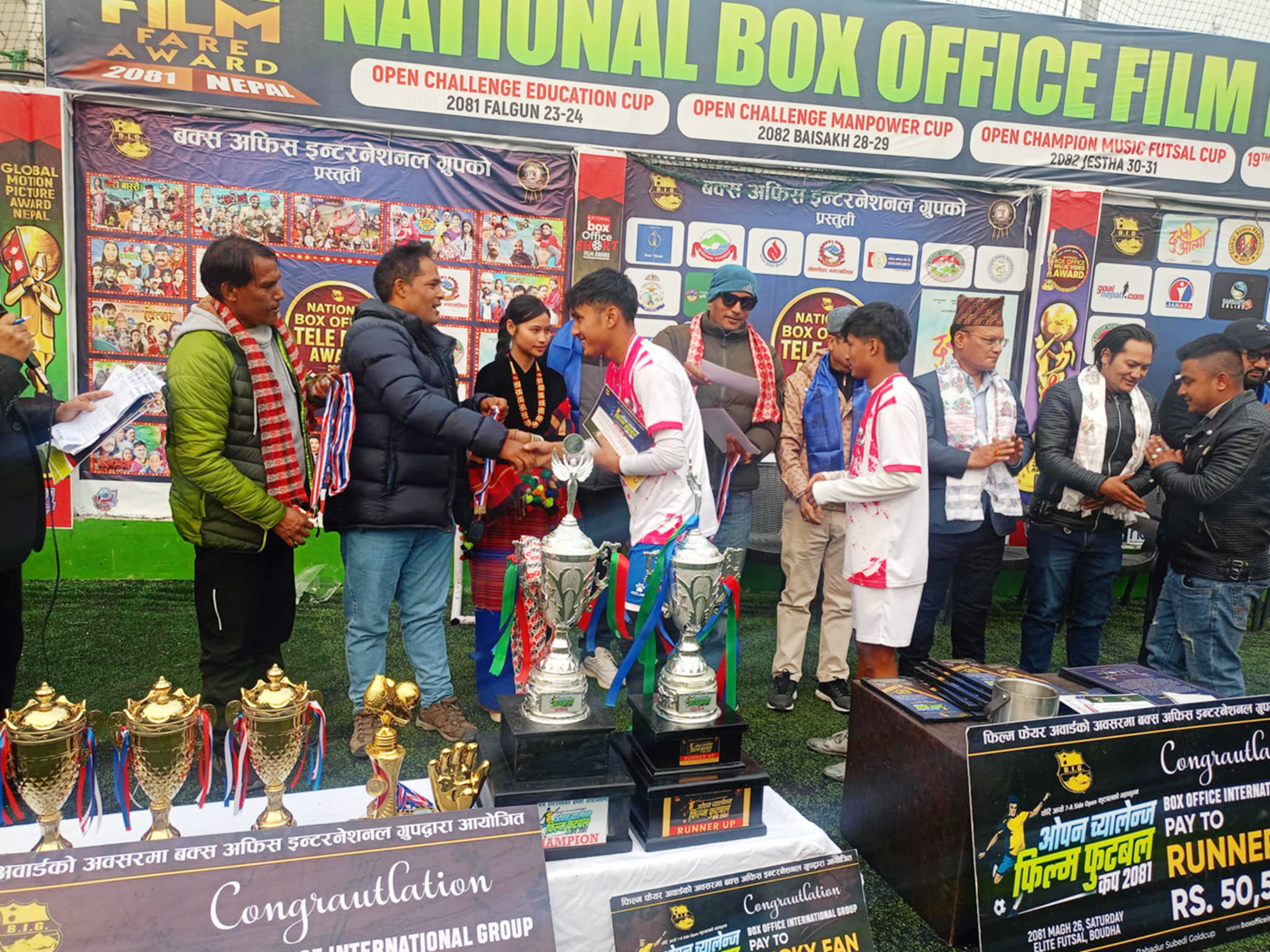 छिट्टै आयोजना हुन गइरहेको नेशनल बक्स अफिस फिल्म फेयर अवार्डको आयोजनाको प्रमोशनमा आयोजना गरेको ओपन च्यालेन्ज फिल्म फुटबल कपको ग्य्राण्ड फाइनल अघि खेलाइएको मैत्रीपूर्ण खेलमा आयोजक बक्स अफिस फुटबल एकेडमीले कपन भेट्रान क्लबलाई ३ गोलको विरुद्ध ५ गोल ठोक्दै विजयी भएको छ । फिल्म कपको भव्य समापनपछि बक्स अफिस इन्टरनेशनल ग्रुपले यही फागुन २३ र २४ गते नेशनल एजुकेसन अवार्डको अवसरमा ओपन च्यालेन्ज एजुकेसन फुटबल कप र जेठ २६ र २७ मा म्युजिक अवार्डको अवसरमा ओपन च्यालेन्ज म्युजिक फुटबल कपको बृहत आयोजनाको तयारीमा रहेको कार्यक्रम अध्यक्ष आरके सुवेदीले बताए ।