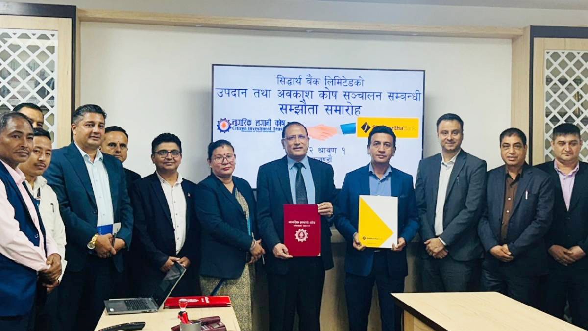 काठमाडौ । नागरिक लगानी कोष र सिद्धार्थ बैंक लिमिटेडबीच उपदान तथा अवकाश कोष सञ्चालनसम्बन्धी सम्झौतामा हस्ताक्षर भएको छ । सम्झौतामा कोषको तर्फबाट कार्यकारी निर्देशक पर्वतकुमार कार्की र बैंकका तर्फबाट प्रमुख कार्यकारी अधिकृत सुन्दरप्रसाद कँडेलले हस्ताक्षर गर्नुभएको हो ।
