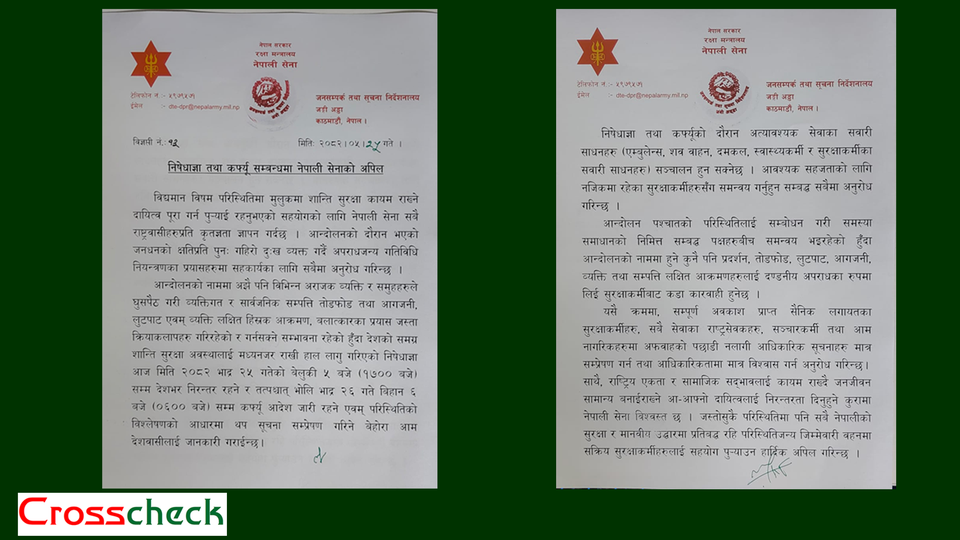 आन्दोलनको नाममा अझै पनि विभिन्न अराजक व्यक्ति र समुहहरुले घुसपैठ गरी व्यक्तिगत र सार्वजनिक सम्पत्ति तोडफोड तथा आगजनी, लुटपाट एवम् व्यक्ति लक्षित हिंस्रक आक्रमण, बलात्कारका प्रयास जस्ता क्रियाकलापहरु गरिरहेको र गर्नसक्ने सम्भावना रहेको हुँदा देशको समग्र शान्ति सुरक्षा अवस्थालाई मध्यनजर राखी हाल लागू गरिएको निषेधाज्ञा आज मिति २०८२ भाद्र २५ गतेको बेलुकी ५ बजे (१७:०० बजे) सम्म देशभर निरन्तर रहने र तत्पश्चात् भोलि भाद्र २६ गते बिहान ६ बजे (०६:०० बजे) सम्म कर्फु आदेश जारी रहने एवम् परिस्थितिको विश्लेषणको आधारमा थप सूचना सम्प्रेषण गरिने बेहोरा आम देशवासीलाई जानकारी गराईन्छ ।