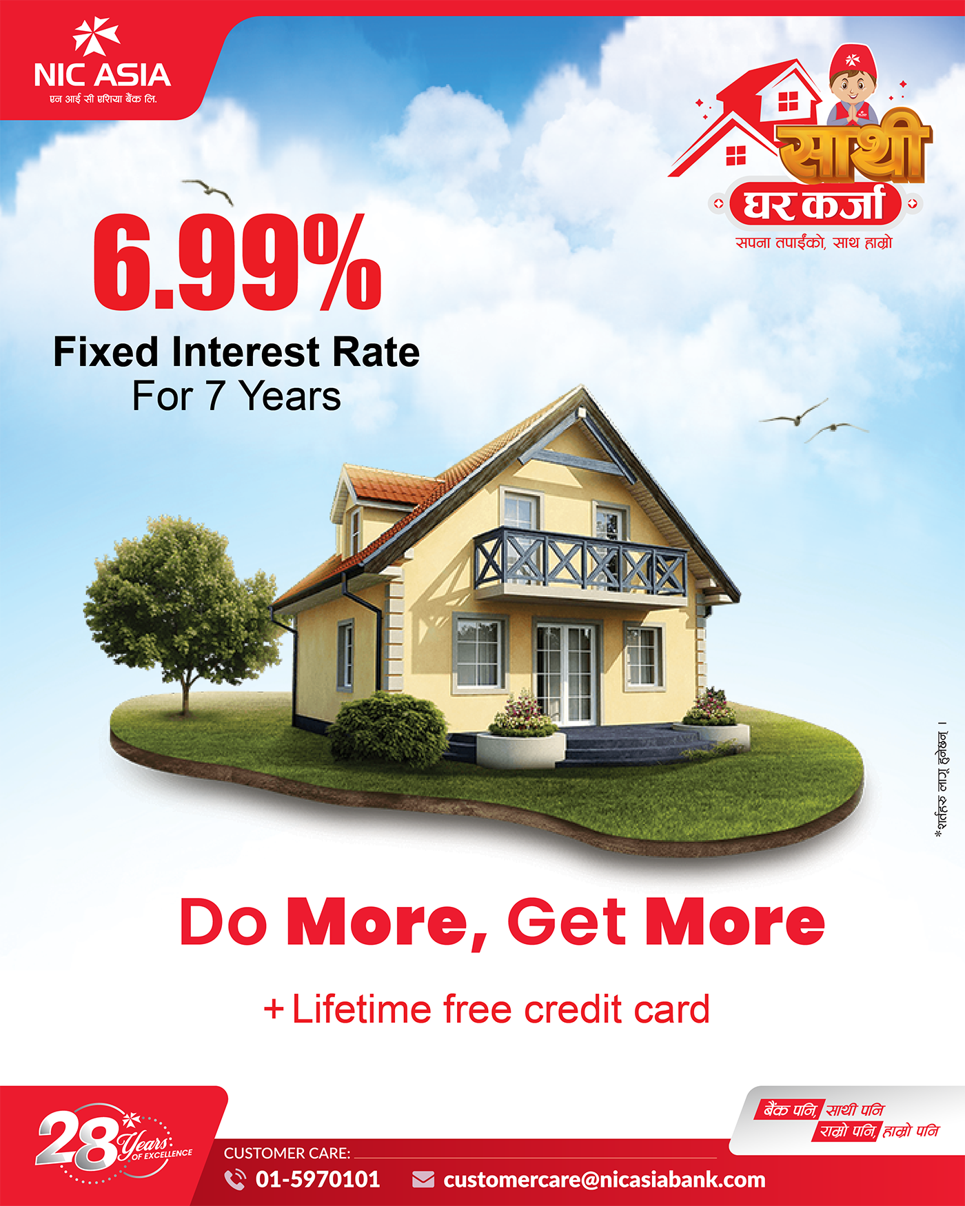 काठमाडौं । एनआईसी एशिया बैंकले ग्राहकहरूको आवश्यकतालाई हरसम्भव पूरा गर्नका लागि १० करोडसम्म घर कर्जा प्रदान गर्ने उद्देश्यअनुरुप ‘एनआईसी एशिया साथी घर कर्जा’ योजना सार्वजनिक गरेको छ । बैंकले सार्वजनिक गरेको सो घर कर्जा योजनाअन्तर्गत ७ वर्षको लागि ६.९९ प्रतिशत स्थिर ब्याजदर एवं अन्य आकर्षक सेवासहित उपलब्ध हुने जनाएको छ ।